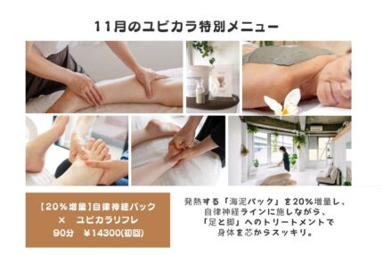 2025-11-01 / 最終更新日 : 2025-11-01 yubikaraーsalon ブーショファン「海泥パック」 【20%増量】11月は背中から自律神経を整える「海泥パック」をご用意しました。 こんにちは。サトコです。 早いものでもう11月。。 急に寒くなってきましたね。 日差しは心地いいけれど、 毎日の寒暖差も激しいので、体調を崩す方もいらっしゃると思います。 季節の […]